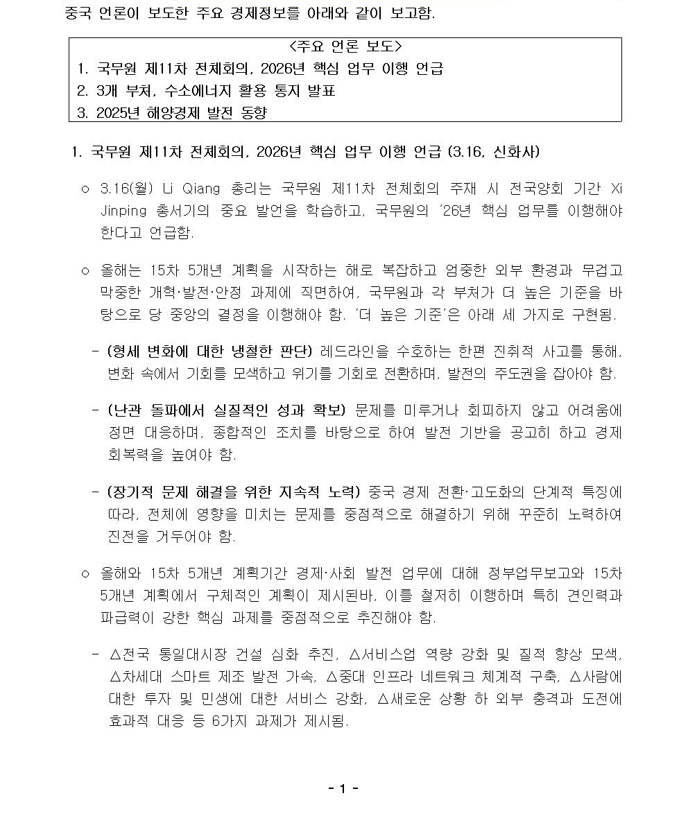 [26.3.17] 국무원 제11차 전체회의, 2026년 핵심 업무 이행 언급 등
