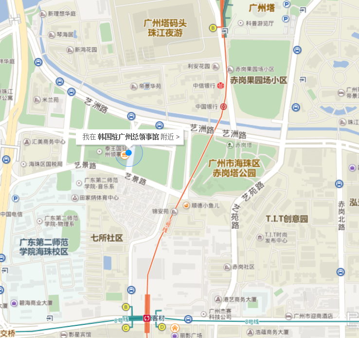 ●지하철 8호선 客村站B출구로 나와 新市头街를 따라 艺景路 교차로까지 와서 길 건너 왼쪽 마주 보이는 곳이며, 지하철역에서 도보로 10분 정도 소요됨.