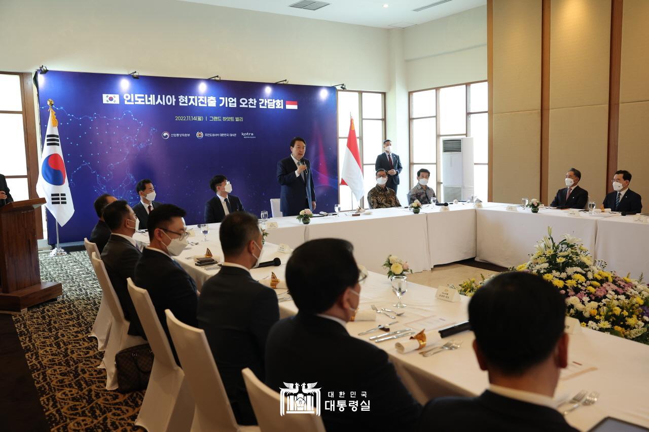 윤석열 대통령은 인도네시아 현지시간으로 11월 14일(월) 11:30~13:00, 1시간 30여분 동안 인도네시아에 진출해 있는 한인 기업인 11명과 점심을 함께 하며 간담회를 가졌습니다.